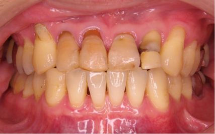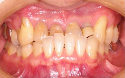 - 前歯部のでこぼこが解消され、前歯の反対咬合も改善された。本症例では、予後不良歯(左側上下7番)を抜歯し、親知らず(左側上下8番)を代わりに配列した。難易度の高い治療なため治療期間が長くなってしまったが、より健康な歯を多く残すことができた。