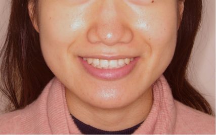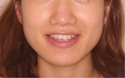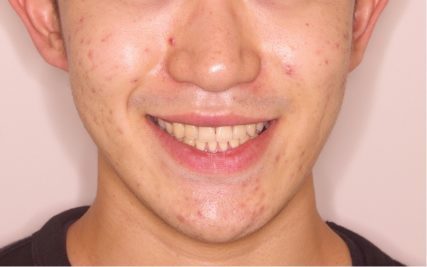前歯正中のズレはほぼ解消されたが、下顎の左方偏位は手術を行わないため変化はない。但し、この程度のズレであれば手術なしでも噛み合わせの改善は可能なので今回は矯正単独による治療を選択した。 - 治療期間
