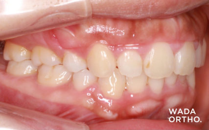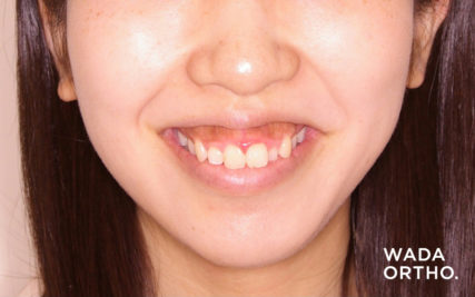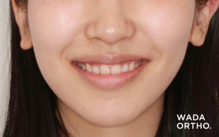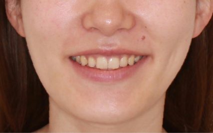 - 最小限の抜歯数をご希望され、口唇の突出度も軽度であったため、上顎小臼歯2本の抜歯による治療を行った。ガミースマイルが改善され、かみ合わせの深さも改善することができた。