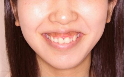 - 口唇の突出を伴う上顎の正中離開(前歯スペース)症例。ガミースマイルも認められる。