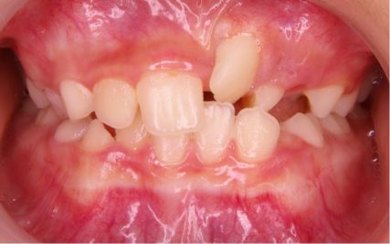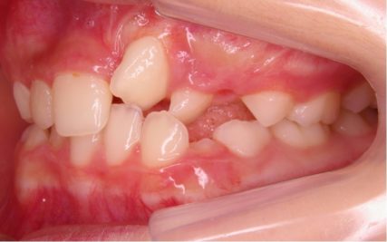 - 叢生を伴う上顎前突症例。口唇の突出も認められる。