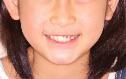 - 下顎右側2番先天欠如し、叢生を伴う上顎前突症例。口唇の突出も認められる。