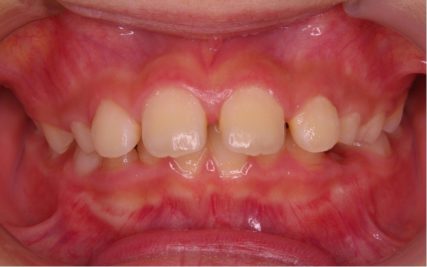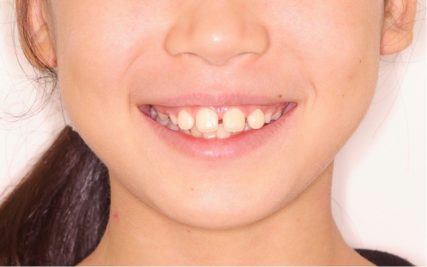 - 正中離開を伴う上顎前突症例。口唇の突出も認められる。