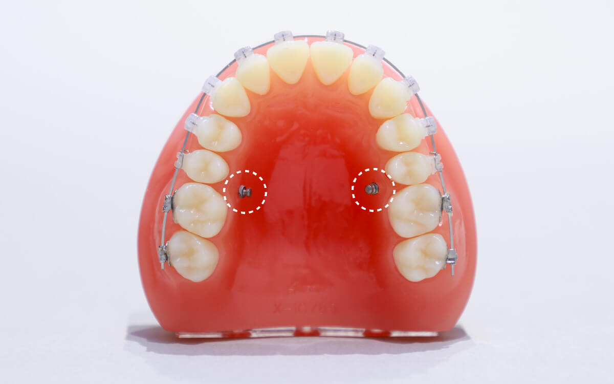 直径わずか1mm程の矯正用アンカースクリューを歯の周囲の骨に埋め込み、それを基軸として歯を引っ張り、奥歯を確実に後ろへ移動することができます。(これは従来ではヘッドギアなどを用いないとできないことでした)